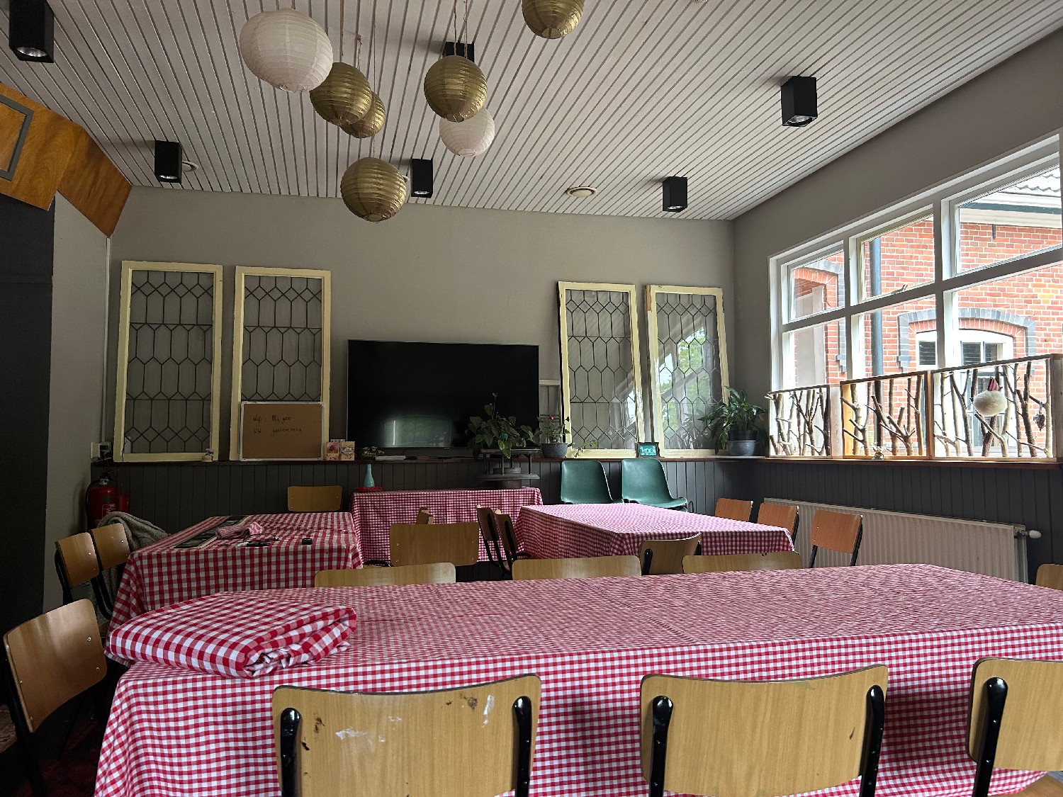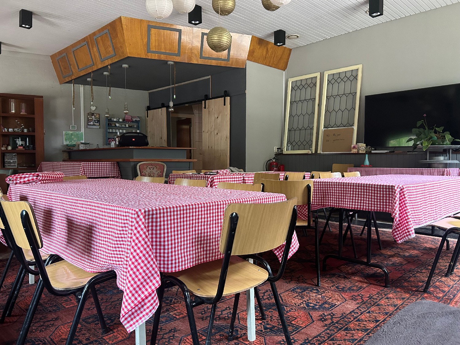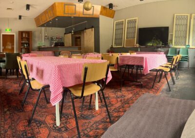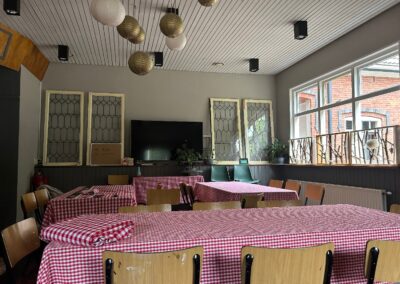 “de Kantine” ruimte voor 40-60 personen, tv scherm/flip over, mogelijkheid tot cateren maar mag ook in eigen beheer.