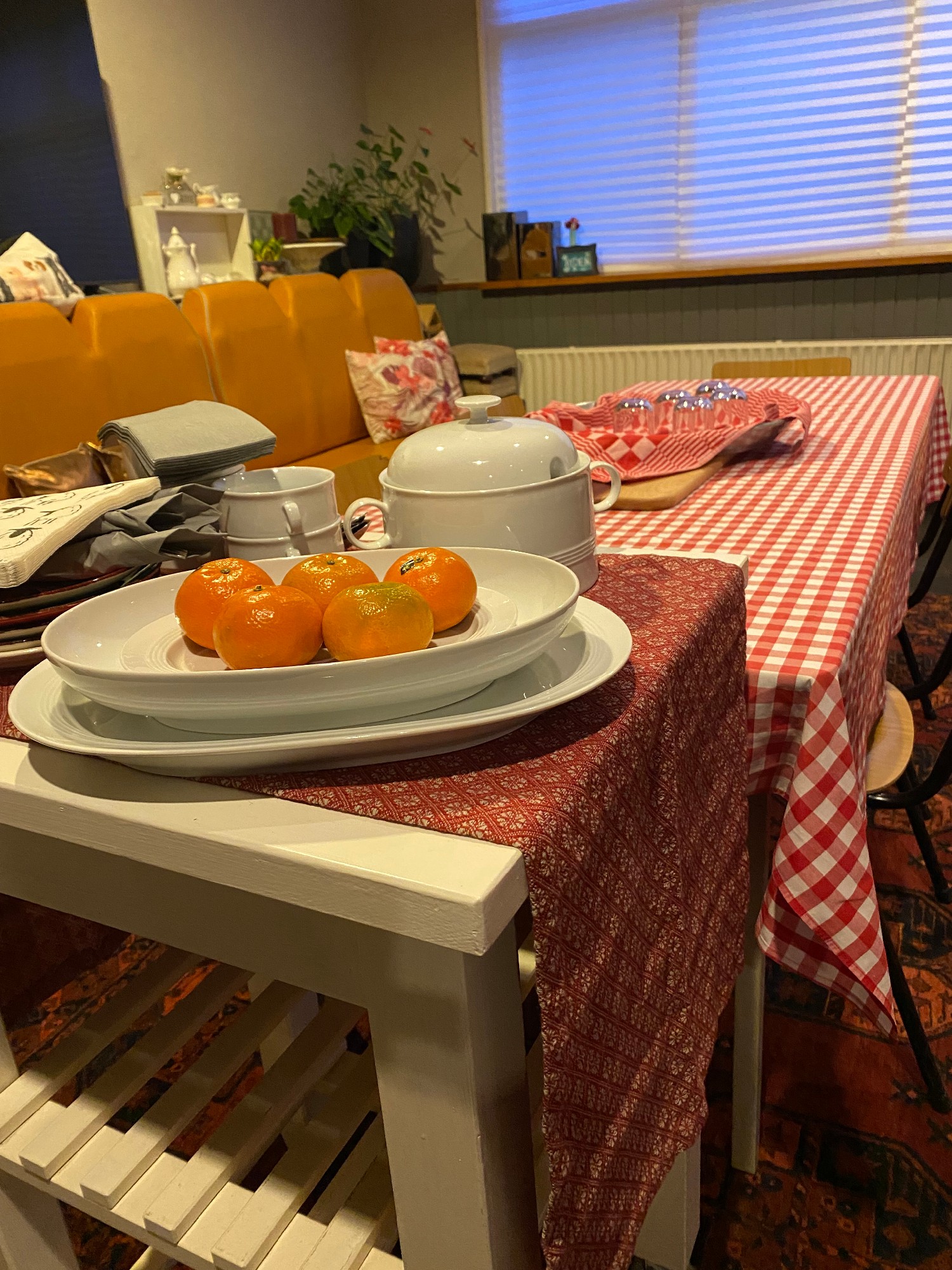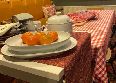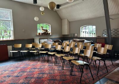 “de Tuinkamer” een ruimte geschikt voor groepen, niet groter dan 6-8 personen. Deze kamer kijkt uit op de monumentale bomen in de voortuin van de boerderij. Eventueel is de voortuin bij de ruimte te betrekken.